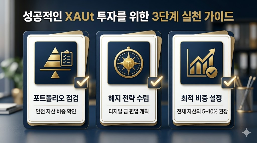 성공적인 투자는 수익을 극대화하는 것만큼이나 리스크를 관리하는 능력이 중요합니다. 저도 처음엔 가상자산 기반이라 불안했는데 실물 금과 1:1로 연동된다는 걸 확인하고 나서 포트폴리오 일부에 담기 시작했습니다. 다만 발행사 리스크는 항상 염두에 두고 있어요. 전체 포트폴리오의 5~10% 정도를 XAUt와 같은 실물 기반 디지털 자산으로 구성해 보시길 권장합니다. 이는 예상치 못한 경제 위기 상황에서 여러분의 자산을 지켜주는 든든한 방어막이 되어줄 것입니다.
