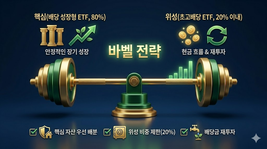 초고배당 ETF는 독이 든 성배가 될 수도, 가뭄의 단비가 될 수도 있는 양날의 검입니다. 가장 현명한 실전 투자법은 배당 성장형 ETF를 핵심(Core)으로 두고, 초고배당 ETF를 부가적인(Satellite) 현금 흐름용으로 섞는 '바벨 전략'입니다.