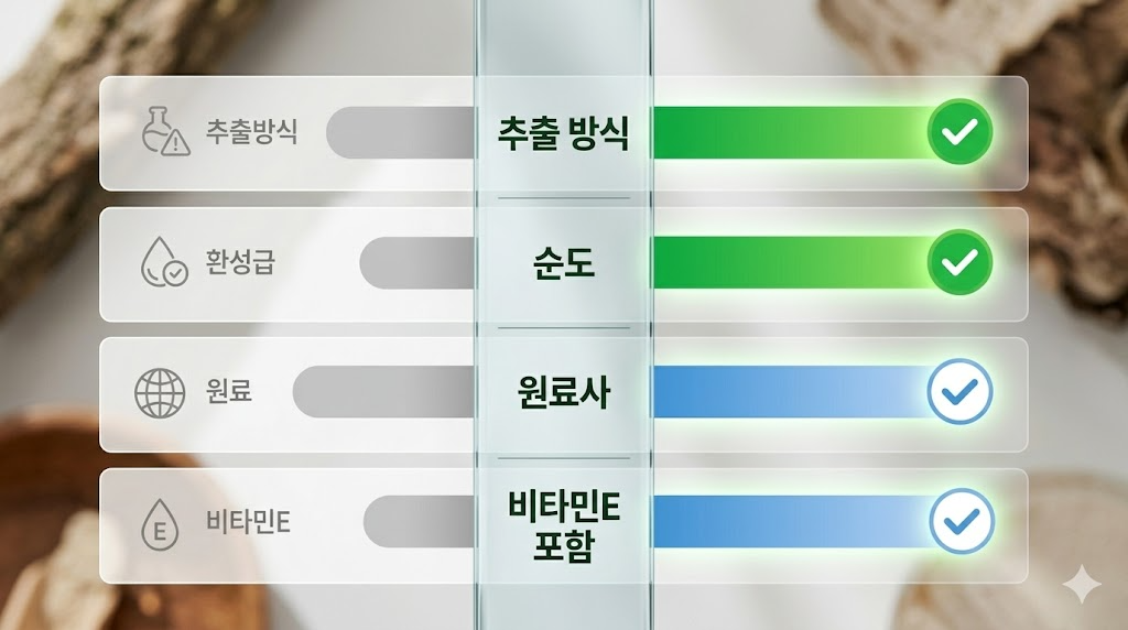 저온 초임계 추출 방식을 쓴 제품은 열이나 화학 용매를 쓰지 않아서 성분 손상이 적고 불순물도 최소화됩니다. 반면 일반 용매 추출 방식을 쓴 제품은 rTG형이라도 잔류 용매 문제가 생길 수 있어요.