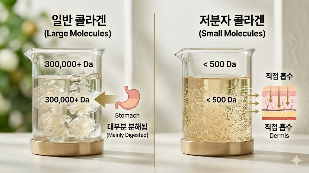 분자량이 큰 일반 콜라겐은 소화 과정에서 대부분 분해되어 버리기 때문에, 피부 진피층까지 도달할 확률이 현저히 낮습니다. 하지만 무조건 숫자가 작다고 해서 다 좋은 것은 아니며, 그 작은 입자가 내 몸 안에서 어떻게 길을 찾아가는지가 더 중요합니다.
