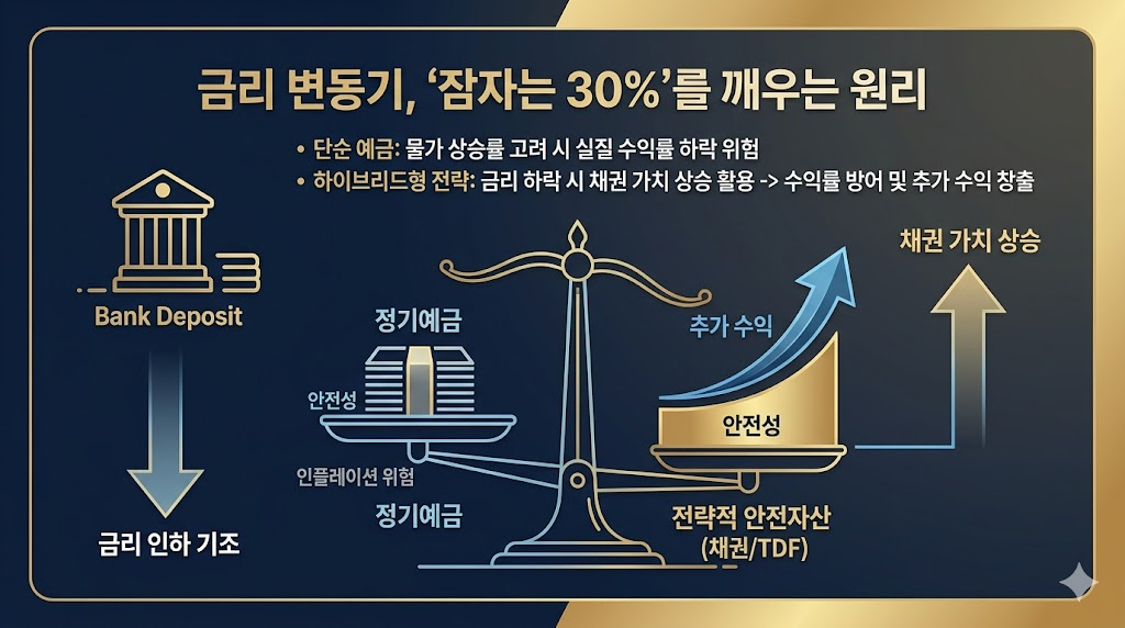고금리 시대가 서서히 저물고 금리 인하 기조가 감지되면서, 기존의 단순 예금 위주 안전자산 배분은 실질 수익률 하락이라는 리스크를 안게 되었습니다. 물가 상승률을 고려하면 예금만으로는 자산 가치를 방어하기 어려운 상황입니다.